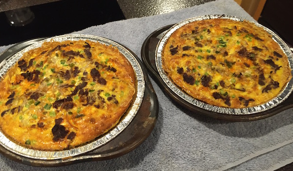 Preheat your oven to 375 degrees.  Coat the pie pans lightly with oil (I like coconut oil for this) or butter.  Place the meat mixture evenly into the two pie pans.  Prepare the usual base quiche mix and add the two extra eggs.  When fully whipped, pour gently over the mixture in the pans.  Sprinkle the remaining Almonds over the fillings and transfer to the oven.  Cook for 30 -40 minutes or until the egg portion of the dish is starting to brown.  Remove from the oven and serve or wrap in foil to transfer to the rink.